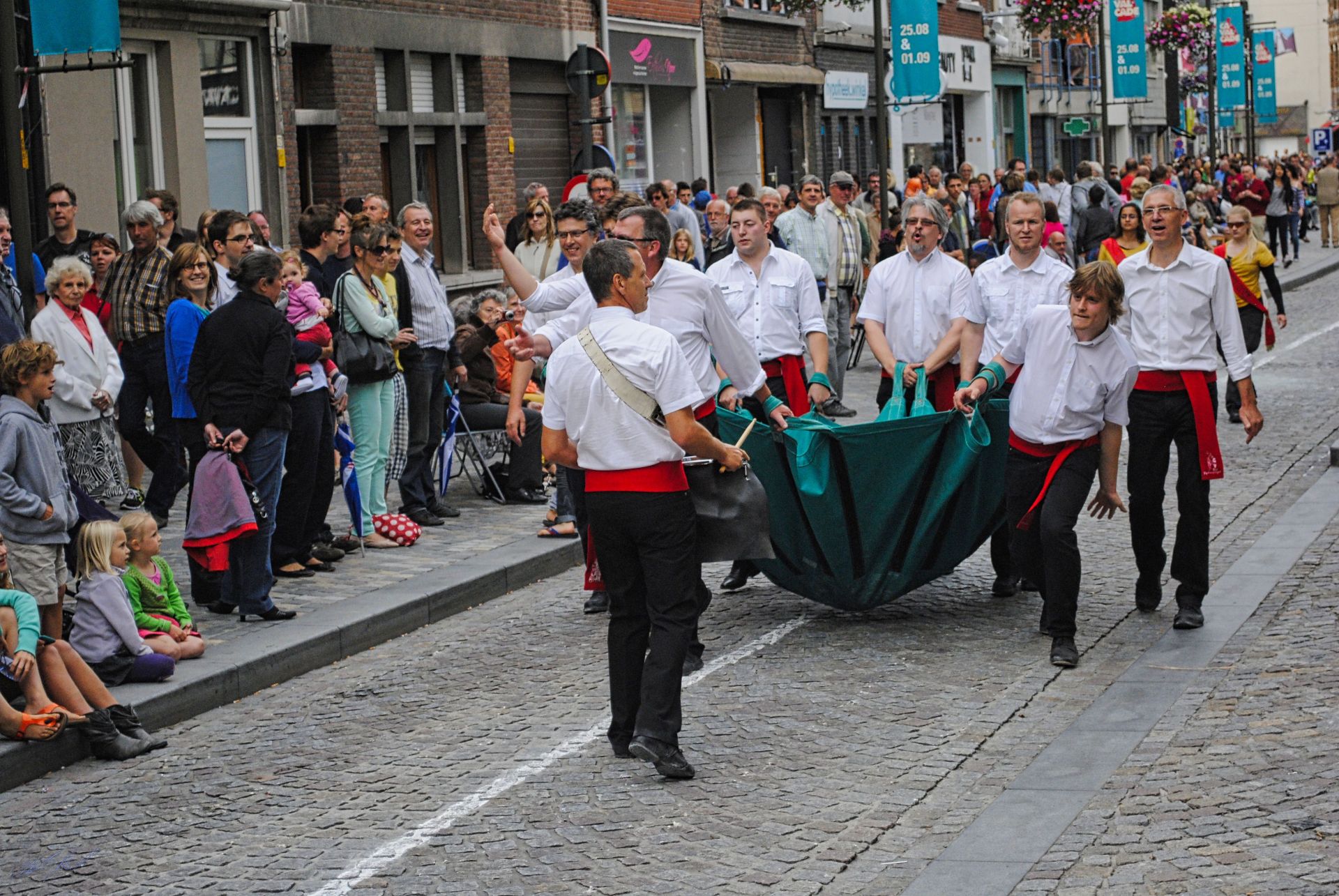 Es folgte die Gruppe mit dem Op-Signjoorken. Zitat von der Webseite der Stadt Mechelen. Der Artikel ist 2020 leider nicht mehr vorhanden: Op-Signjoorken stellt einen Mann dar, der sich übermäßigem Alkoholkonsum, Völlerei und Wollust hingibt. Als Strafe für sein ausschweifendes Leben wird er seit 1644 in Form einer Wurfpuppe dem Spott seiner Mitbürger ausgesetzt, während er auf einer Segeltuchplane in die Luft geworfen wird. Op-Signoorken gilt als das Stadtmaskottchen von Mechelen. Ein Standbild von ihm ziert den Grote Markt vor dem Rathaus.
